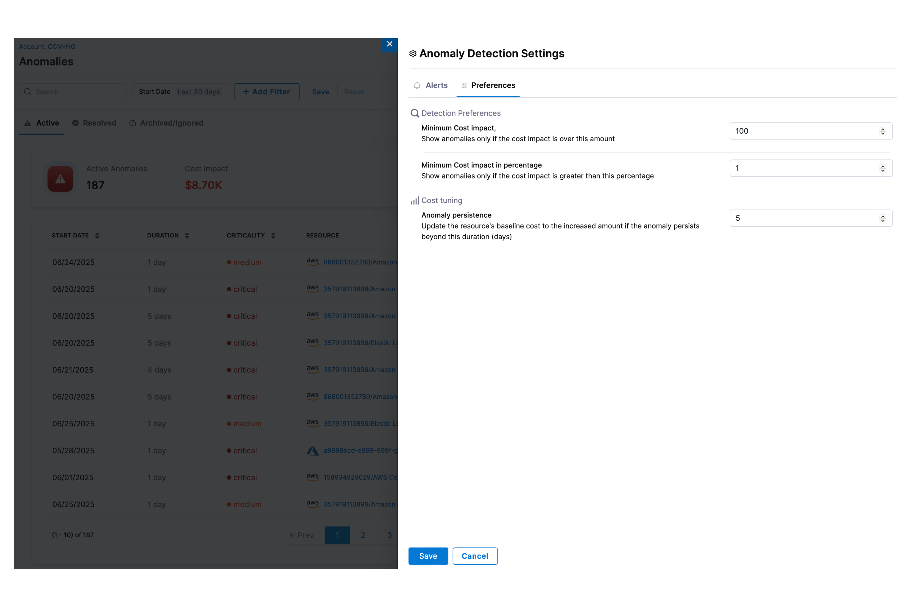 - Minimum Cost Impact (Amount): This setting allows you to set a threshold for the cost impact in USD, meaning that anomalies will only be shown if the financial impact exceeds the specified amount.